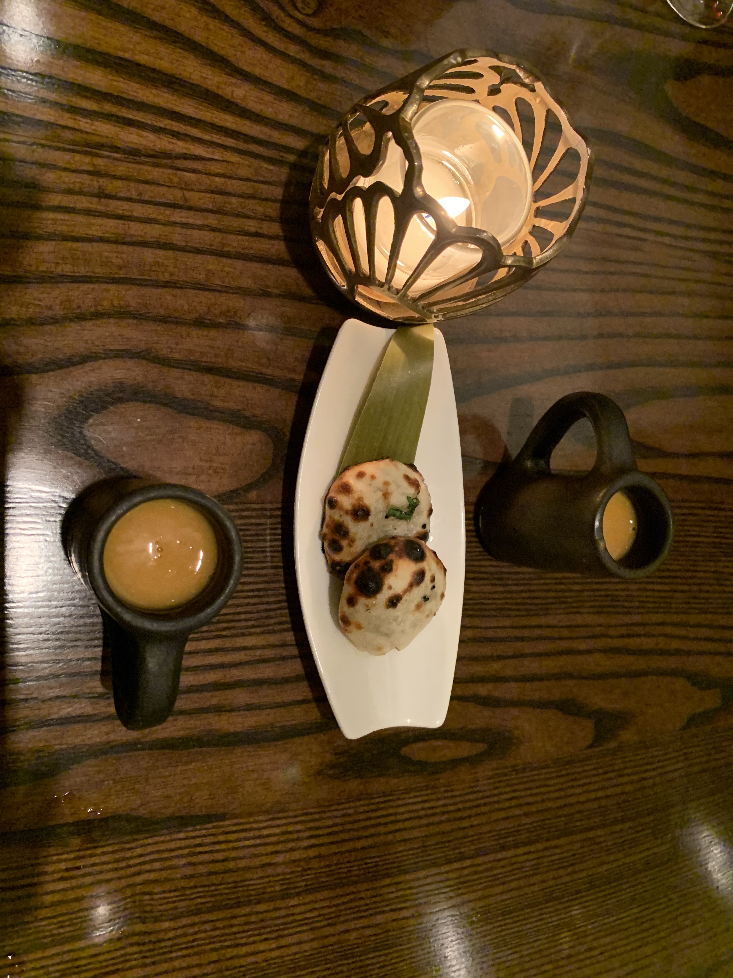 Pumpkin coconut shorba with mini blue cheese naan; warm, yummy gooeyness of melted blue cheese on your tongue as you bite into the naan. Chase it with the sweet creamy shorba and savor that symphony for a bit.